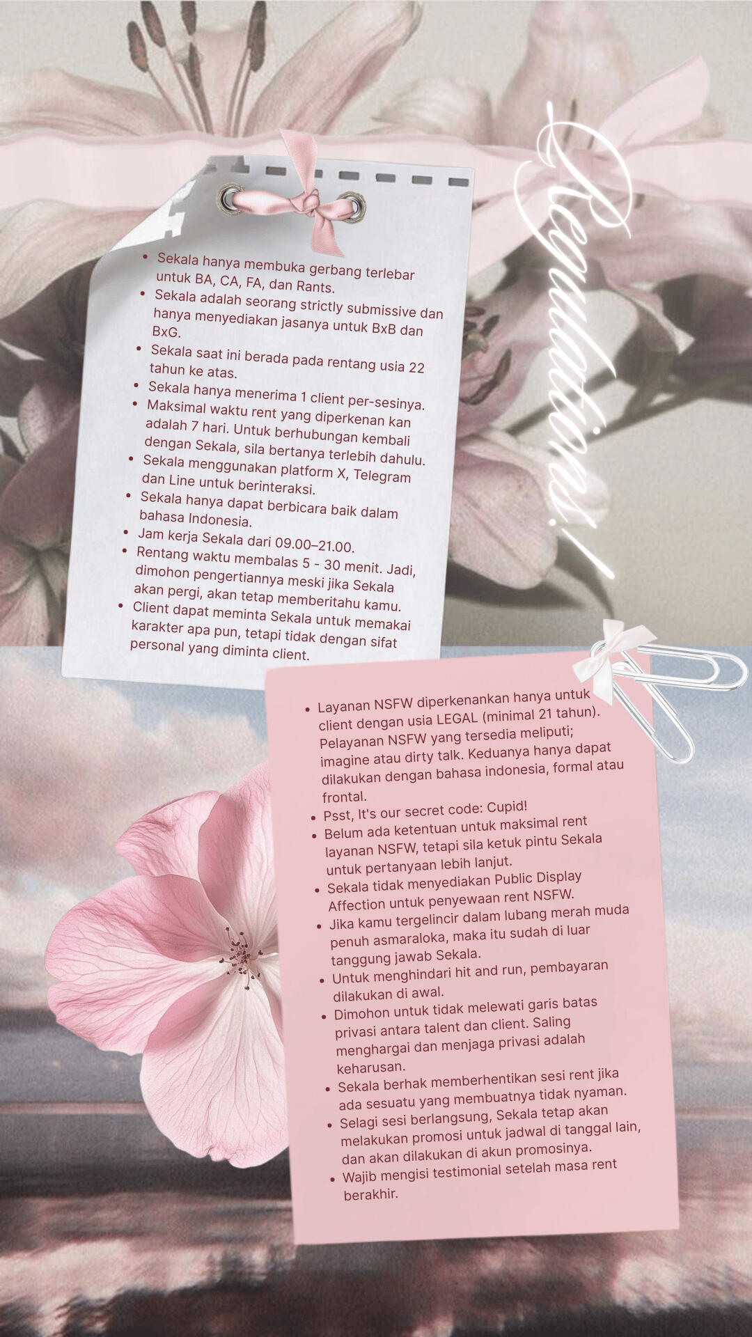 28.OOO /day (VVIP)Sekala akan menghidupkan kembali rona yang sempat lenyap dari duniamu. Apa pun yang kamu buka untuknya, akan ia sambut dengan penuh kehati-hatian. You can get all free service for SFW, such as; Flexible work hours, soft imagine in sfw way, face claim request, profile picture request and petname request